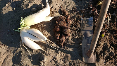 新年を前に、正月の雑煮用の大根と里芋を畑で掘っていると、土の中の